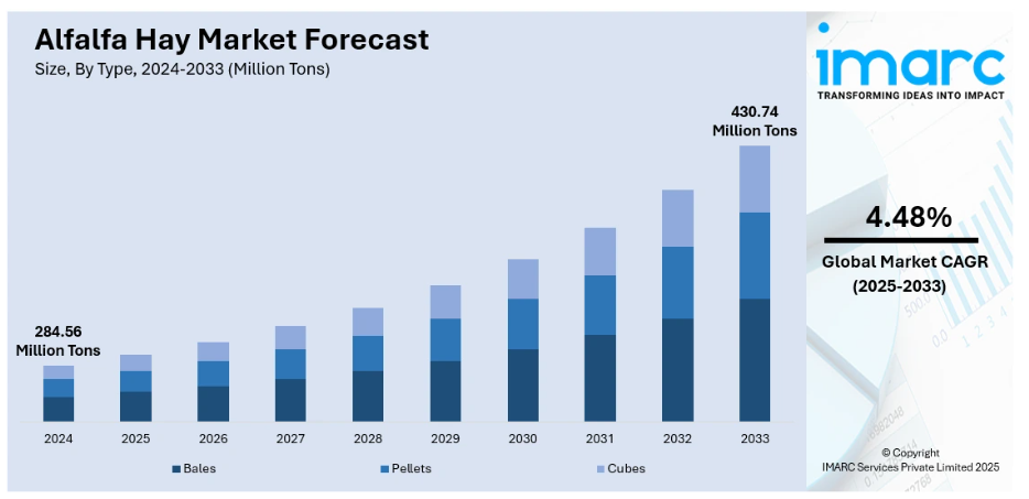 乳製品および肉製品に対する国際的な需要の増加は、タンパク質豊富な飼料の需要を押し上げており、アルファルファ干し草の高い栄養価から、望ましい飼料として位置づけられています。特に発展途上市場における畜産部門の拡大が、この傾向をさらに支えています。農業技術、灌漑方法、収穫技術の進歩により、作物の収量と品質が向上し、アルファルファ干し草の入手可能性とコストが低下し、より経済的になりました。特に耕作可能な土地が限られている国や気候条件が劣悪な国への輸出機会も、国際貿易を刺激しています。さらに、農家の間でアルファルファが動物の健康と生産性に与える利点についての認識が高まっていることも、採用を促進し続けており、アルファルファ干し草市場の継続的な成長につながっています。