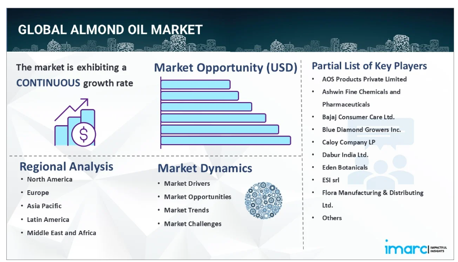 • IMARCのレポートは、2019年から2033年までのアーモンドオイル市場における様々な市場セグメント、過去および現在の市場動向、市場予測、市場ダイナミクスに関する包括的な定量分析を提供します。