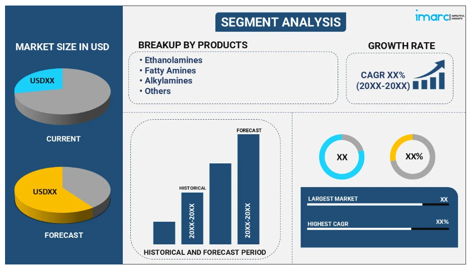 本アミン市場調査レポートでは、製品に基づく市場の詳細な内訳と分析を提供しております。これにはエタノールアミン、脂肪族アミン、アルキルアミン、その他が含まれます。レポートによれば、エタノールアミンが最大のセグメントを占めております。