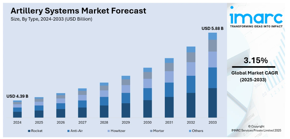 IMARCグループは、世界の砲兵システム市場における各セグメントの主要トレンド分析に加え、2025年から2033年までの世界・地域・国別予測を提供しております。市場は種類、構成部品、口径、射程、エンドユーザーに基づいて分類されております。