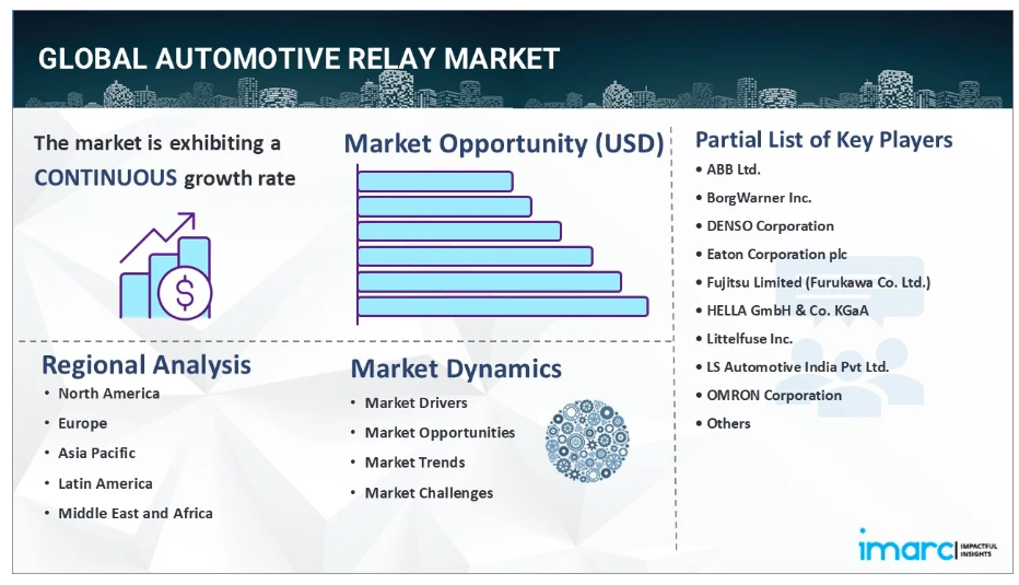 急速な都市化と所得水準の上昇に伴い、高級車やスマートカーへの需要が高まっております。これにより、自動車における最新インフォテインメントシステムの採用が促進されております。これは、利便性の提供と総合的な運転体験の向上を図る自動車用リレーの需要に好影響を与える主要因の一つであります。さらに、多くの国々で政府が導入した厳しい燃費規制が車両の電動化の必要性を促進しており、これが市場成長に寄与しています。これに加え、致命的な交通事故件数の著しい増加が、エアバッグ、バックセンサーシステム、エネルギー吸収式ステアリング、シートベルト、ヘッドアップディスプレイ(HUD)、ヘッドレストなどのスイッチにおける自動車用リレーの需要を加速させています。さらに、インフラ開発への投資増加に伴い、建設用途でのオフロード車両の使用が増加していることも、市場成長を後押ししています。加えて、コネクテッドカーや最新車両の普及傾向は、パワーステアリング、サンルーフ、パワーウィンドウ、クルーズコントロール、ナビゲーションサービス向けコンパクトリレーの需要を牽引すると予測されます。