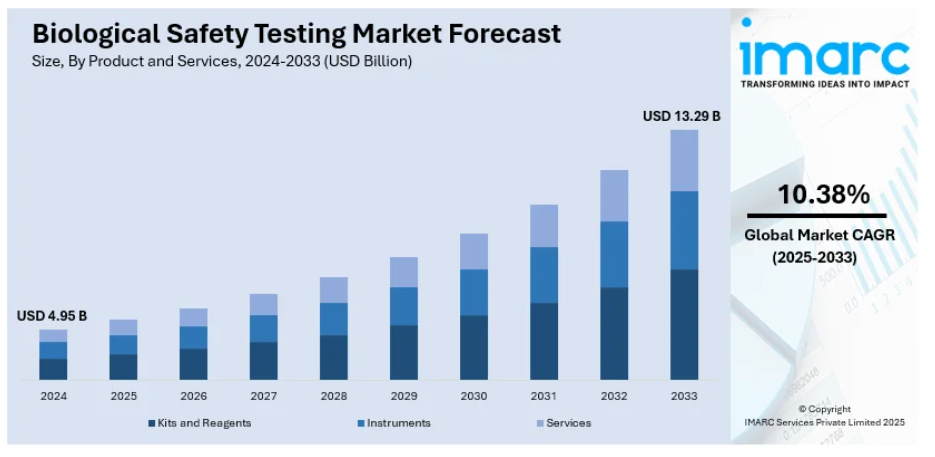 世界の生物学的安全性試験市場規模、シェア、動向および予測:製品・サービス別、試験種類別、用途別、地域別(2025-2033年)