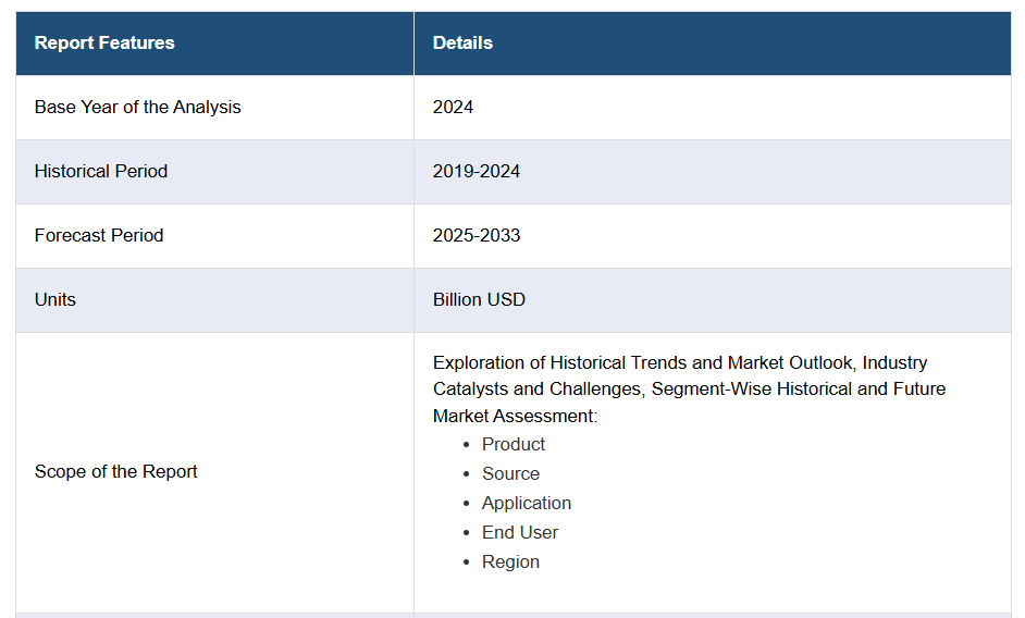 IMARC Groupは、市場の各セグメントにおける主要トレンドの分析に加え、2025年から2033年までのグローバル、地域、国レベルでの予測を提供しております。本レポートでは、製品、原料源、用途、エンドユーザーに基づいて市場を分類しております。