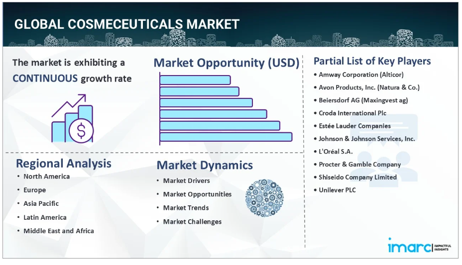 - IMARCのレポートは、2019年から2033年までのコスメシューティカルズ市場における様々な市場セグメント、過去および現在の市場動向、市場予測、市場ダイナミクスに関する包括的な定量分析を提供します。