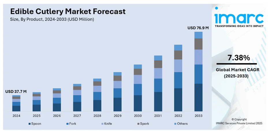 - IMARCの産業レポートは、2019年から2033年までの食用カトラリー市場について、様々な市場セグメント、過去および現在の市場動向、市場予測、市場ダイナミクスに関する包括的な定量分析を提供します。