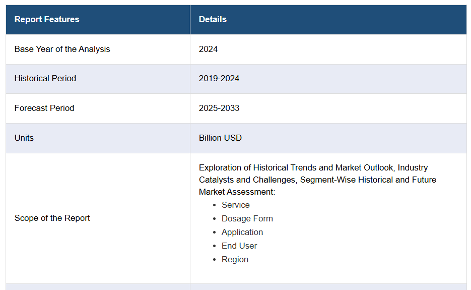 IMARC Groupは、各市場セグメントにおける主要トレンドの分析に加え、2025年から2033年までのグローバル、地域、国レベルでの予測を提供しております。本レポートでは、サービス、剤形、用途、エンドユーザーに基づいて市場を分類しております。