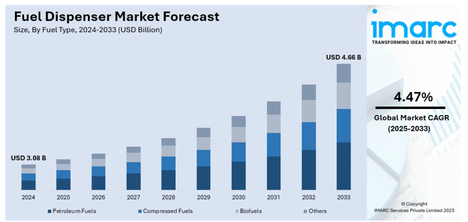 自動化、デジタルシステムの統合、より信頼性が高く効率的なディスペンサーの開発などの技術進歩が、市場の拡大を推進しています。タッチスクリーン、非接触型決済、リアルタイムのデータ追跡は、業務効率とユーザーエクスペリエンスの向上に役立つ先進技術の例です。タッチスクリーンインターフェースを備えた燃料ディスペンサーは、シンプルで使いやすいインターフェースを備えており、ロイヤルティプラン、プロモーションオファー、燃料タイプの選択など、さまざまな選択肢を簡単に操作することができます。さらに、近距離無線通信(NFC)やモバイル決済アプリなどの非接触型決済システムの普及が進んでおります。これらは迅速かつ安全な取引を可能にするため、燃料ディスペンサー市場の成長に寄与しております。世界の近距離無線通信(NFC)市場規模は2024年に254億米ドルに達しました。この機能はユーザーの利便性向上と待ち時間短縮に有効です。加えて、企業は顧客満足度を高めるアプリを次々とリリースしております。例えば、スミス・オイル社は2023年8月23日、モバイルアプリケーションをリリースしました。このアプリにより、スマートフォンで数回タップするだけでACHデビットによる給油時の支払いが可能となり、ポンプでの価格ロールバックを通じて即時割引を受けられます。リキッドバーコード社のC-StorePay技術を搭載したこの革新的な新アプリは、既存のPOSシステムとシームレスに統合され、信頼性の高いストライプ決済システムを採用しています。お客様はスミス・オイルの給油所へお越しいただき、初回訪問時に簡単な手順で銀行口座を連携するだけでご利用いただけます。