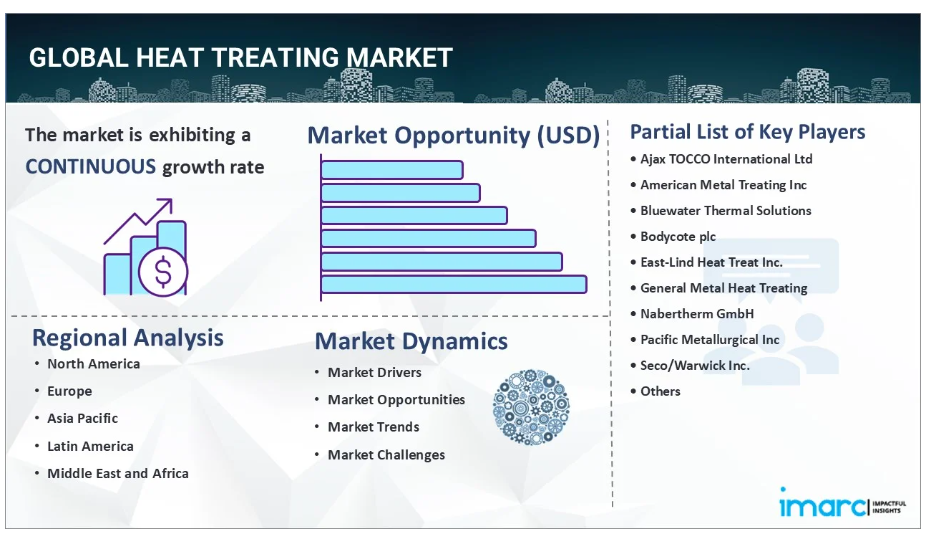 国際貿易の拡大、ビジネス旅行の増加、観光産業の成長に伴う航空交通量の増加は、市場成長を促進する主要な要因の一つです。さらに、世界的な自動車販売の増加は、顧客ニーズと環境基準を満たしつつ、自動車産業における各種部品の効果的な利用を向上させるための熱処理需要を牽引しています。これに加え、金属の加工性や表面特性の改善、強度・硬度・耐摩耗性の向上に寄与するため、熱処理プロセスはニッケルチタン(Ni-Ti)系合金の熱機械的特性向上にも活用されています。これらの合金は医療分野で広く応用され、コイルの製造や脳動脈瘤(頭蓋内動脈の局所的な拡張)の治療に用いられています。さらに、主要市場プレイヤーは、熱処理プロセスの自動化を実現する信頼性の高い低コストスマートシステムを導入しております。これには制御ユニット、アルゴリズム、センサー、駆動回路が含まれ、時間短縮と人的介入・エラーの低減に寄与します。これにより、世界中の建設および石油・ガス産業における熱処理の応用に影響を与えることが予想されます。