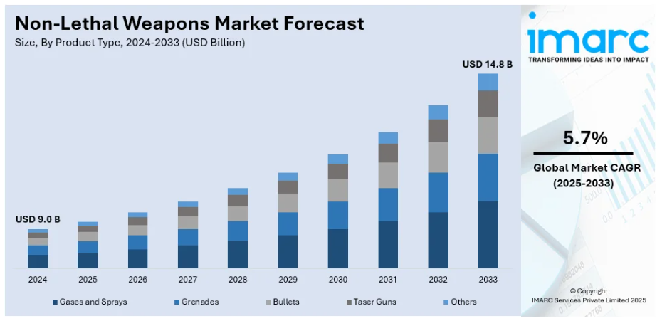 - IMARCのレポートは、2019年から2033年までの非致死性兵器市場における様々な市場セグメント、過去および現在の市場動向、市場予測、市場力学に関する包括的な定量分析を提供します。
