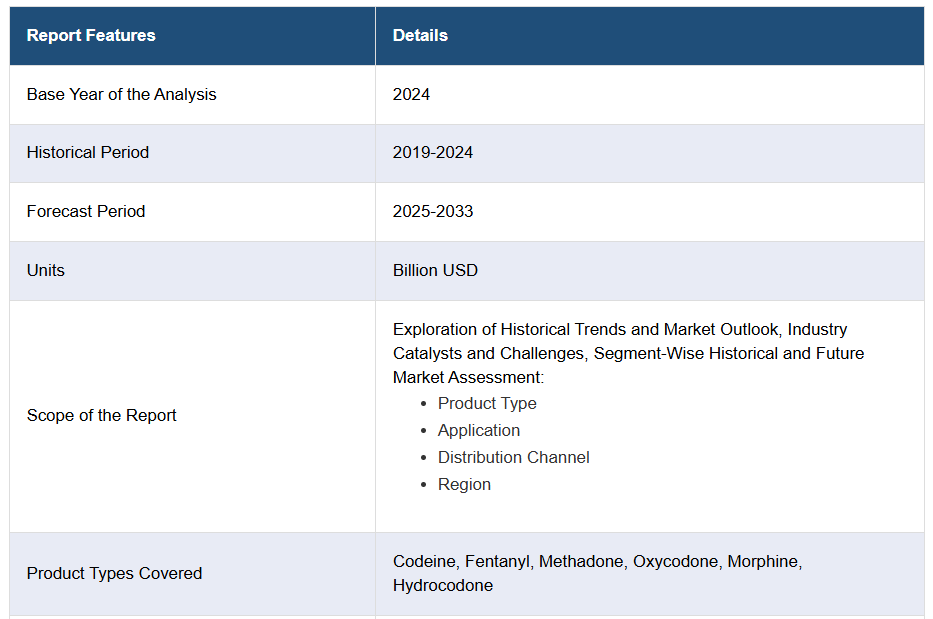 - IMARCの産業レポートは、2019年から2033年までのオピオイド市場における様々な市場セグメント、過去および現在の市場動向、市場予測、市場ダイナミクスに関する包括的な定量分析を提供します。