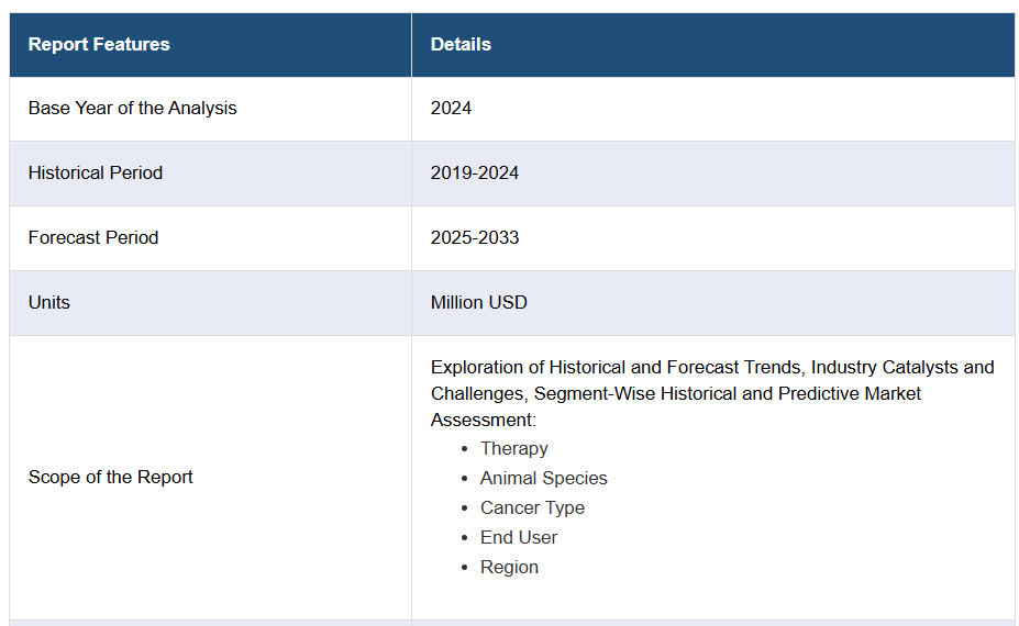 - IMARCのレポートは、2019年から2033年までのペットがん治療薬市場における様々な市場セグメント、過去および現在の市場動向、市場予測、市場ダイナミクスに関する包括的な定量分析を提供します。