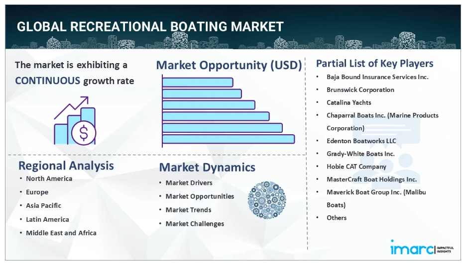 IMARC Groupの報告書によると、世界のアドベンチャーツーリズム市場規模は2023年に4,070億米ドルに達しました。アドベンチャーツーリズムは旅行体験そのものに焦点を当て、人々が興味深い活動を求めることを促します。レクリエーションボートは、カヤック、セーリング、ジェットスキーなど、冒険を求める方々に多様な可能性を提供します。アドベンチャーツーリズムには、ウェイクボード、スキューバダイビング、フィッシングなどの活動が含まれます。この拡大は、特定のウォータースポーツを目的とした幅広いレクリエーションボートの需要を牽引しています。多くの旅行代理店やツアーオペレーターが、アドベンチャーツーリズムパッケージにボートアクティビティを取り入れています。こうしたパッケージは、総合的な冒険体験を求める人々を惹きつけ、レクリエーションボートへの関与を高めています。ソーシャルメディアプラットフォームの増加に伴い、冒険体験の共有も増加しています。多くの観光客がSNS映えするボートアドベンチャーを求め、これがレクリエーションボート産業を促進しています。湖、河川、沿岸地域はアドベンチャーツーリズムの一般的な目的地です。これにより、観光客がこれらの環境を探索できるボートの需要が促進され、ボートのレンタルや購入が増加しています。
