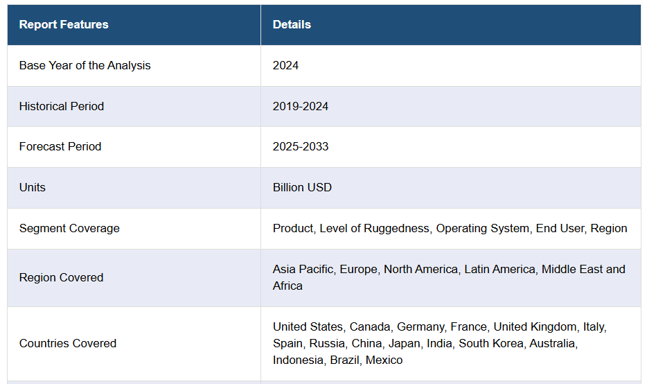 IMARC Groupは、グローバル堅牢ディスプレイ市場レポートの各サブセグメントにおける主要トレンドの分析に加え、2025年から2033年までのグローバル、地域、国レベルでの予測を提供しております。当レポートでは、製品、堅牢性のレベル、オペレーティングシステム、エンドユーザーに基づいて市場を分類しております。