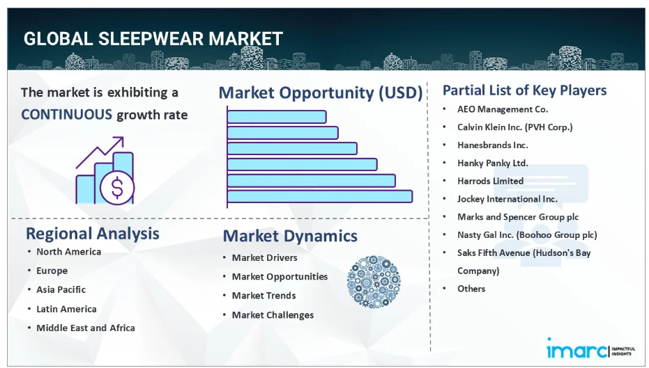 主要企業は、吸湿発散性、温度調節機能、抗菌性といった先進的な機能を備えた寝間着を開発しております。さらに、著名なデザイナーやセレブリティ、インフルエンサーとのコラボレーションを通じて注目を集め、市場に独自の製品を提供しています。加えて、主要プレイヤーは、オーガニックコットンや再生ポリエステルといった持続可能な素材を使用したエコフレンドリーなラインの展開に注力し、消費者層の拡大と売上向上を図っております。加えて、ECサイトやソーシャルメディアを活用し、ターゲティング広告、顧客エンゲージメント、パーソナライズドマーケティングのためのデータ収集を行っています。これとは別に、主要ブランドは国際市場に注力し、異なる文化的規範や消費者のニーズに合わせて製品を適応させています。同時に、主要企業は高成長地域での小売拠点を拡大し、ECを通じて新規市場へ参入しています。