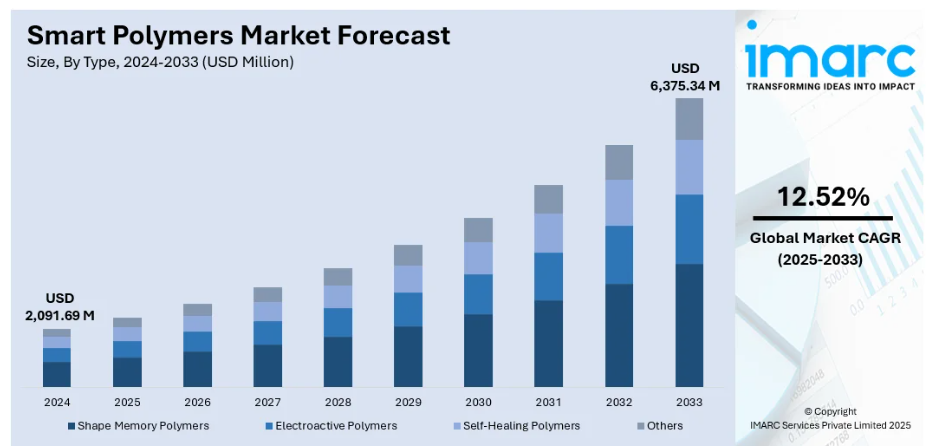 スマートポリマー市場における最も顕著な世界的な推進要因の一つは、様々な産業分野における持続可能な製品開発において、より高度な材料が必要とされている点です。効率性、柔軟性、持続可能性への注目が高まる中、応答性と資源消費量の低減が求められる用途において、スマートポリマーが広く活用されています。 報告書によりますと、2025年5月にコベストロ社はAI技術向け高性能ポリカーボネートおよびTPUスマートポリマーを発表し、ウェアラブルデバイス、ロボティクス、エネルギーシステムの加速化を図るとともに、スマートポリマー市場における持続可能なイノベーションを推進しております。さらに、自己修復性、形状記憶性、刺激応答性といった特性は、革新性と回復力が重要な自動車、医療、包装、消費財産業に適しています。高性能用途におけるスマートポリマー応用分野の成長は、軽量材料、再生可能技術、コスト効率の高い製造への長期的な世界的な移行を促進する役割を強調しています。加えて、高分子化学とナノテクノロジーの進歩により新たな機能特性が実現され、様々な産業分野での使用範囲がさらに拡大しております。持続可能性と高性能材料に対する世界の優先課題との融合により、スマートポリマーは将来の市場における重要な基盤材料として位置づけられ、世界的な産業革新の鍵となる存在としての地位を強化しております。