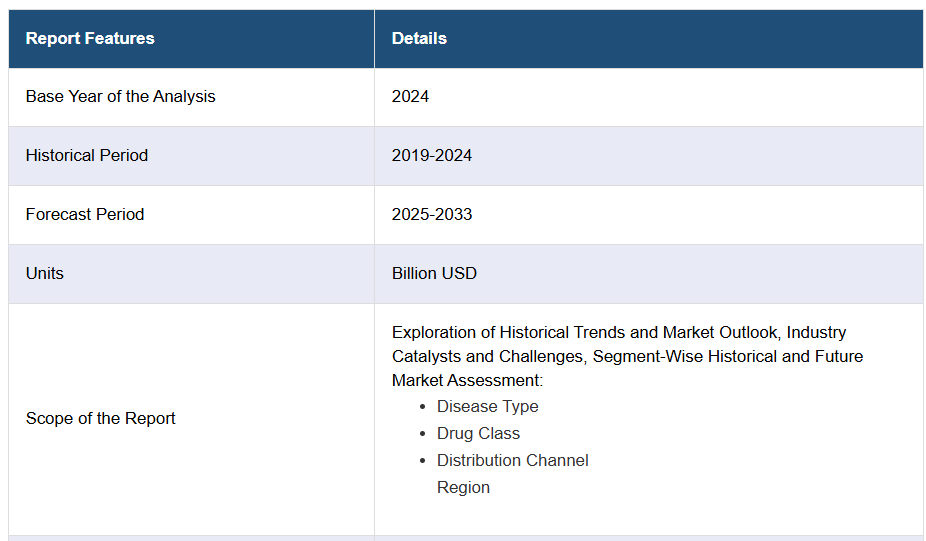 IMARC Groupは、各市場セグメントにおける主要トレンドの分析に加え、2025年から2033年までのグローバル、地域、国レベルでの予測を提供しております。本レポートでは、疾患タイプ、薬剤分類、流通経路に基づいて市場を分類しております。