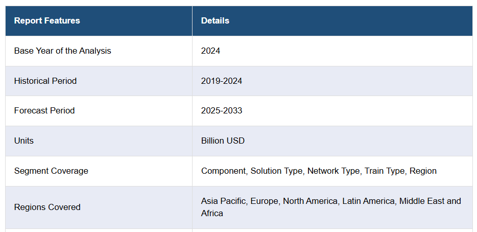IMARC Groupは、世界の列車制御管理システム市場における各サブセグメントの主要トレンド分析に加え、2025年から2033年までの世界・地域・国レベルでの予測を提供しております。本レポートでは、市場をコンポーネント、ソリューションタイプ、ネットワークタイプ、列車タイプに基づいて分類しております。