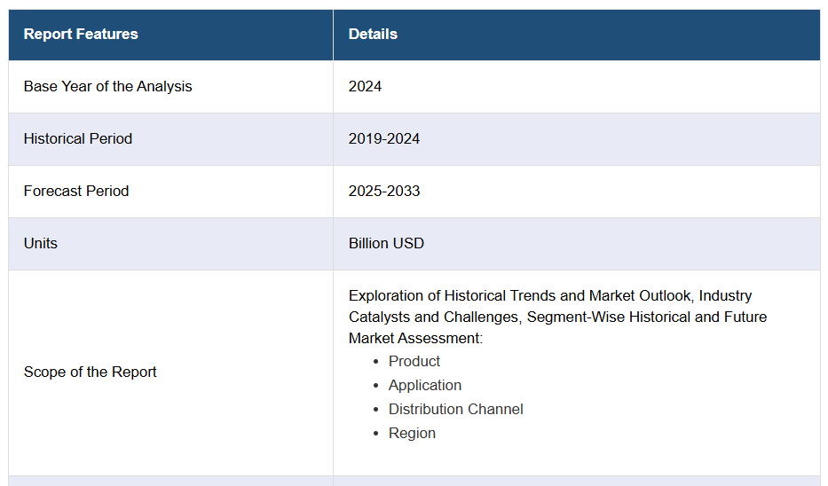 IMARC Groupは、各市場セグメントにおける主要トレンドの分析に加え、2025年から2033年までのグローバル、地域、国別の予測を提供しております。本レポートでは、製品、用途、流通チャネルに基づいて市場を分類しております。